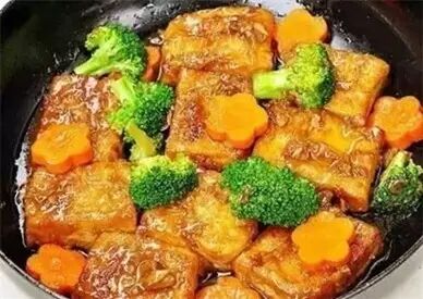 食材:南豆腐350克,胡萝卜50克,西兰花100克,姜适量,玉米淀粉20克,生抽,砂糖,素蚝油,料酒,高汤