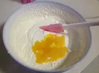 将蛋黄液分次加入到打发的淡奶油中,加一次,用刮刀拌匀一次,直到全部混合均匀。
