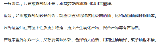 首先,煎炸用油应该选择纯度比较高的油。因为油的杂质越少,在高温下才越稳定,越不易生成有害物质。