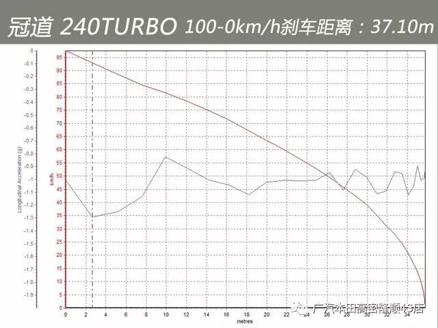 由于冠道240TURBO的底盘、刹车系统、轮圈尺寸甚至轮胎品牌都并未做任何改变,所以,最终刹车成绩与370TURBO的表现相近,100-0km/h的刹车成绩为37.10m,整体刹车表现相当出色。