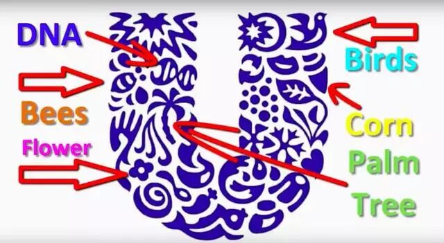 联合利华的logo由许多大自然的东西组成,包括DNA,蜜蜂,花,鸟,玉米,椰子树等等,代表这家公司生产的产品是天然,亲近自然。