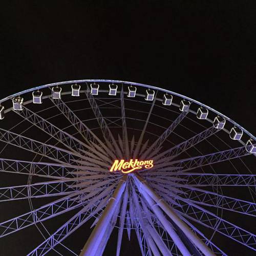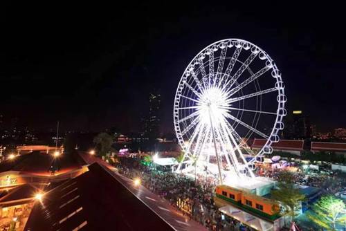 还有一个终极大招——摩天轮!偌大的摩天轮就停靠在河边,不断变幻的霓虹灯就着缓缓转动的摩天轮,超!带!感!在最高处俯瞰曼谷,并许下一个愿望,实在不失为一个浪漫的夜晚。票价300铢/人(约57元人民币),4圈左右,速度掏钱梦幻一把。