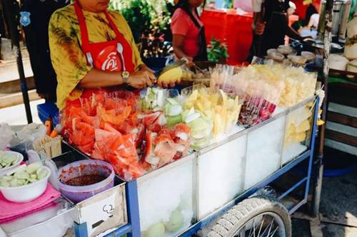 咦,为什么老是有五颜六色的水果在干扰我理智的神经?这时候请立刻甩掉理智,切好的水果正躺在冰柜里等着你呢~在泰国,吃水果必然会配上辣椒盐、梅子粉或虾酱辣椒盐。推荐青芒果配辣椒盐,好吃到满血!!!