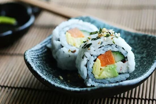 原料:米饭、鸡蛋2个、胡萝卜、黄瓜、蟹柳4根、牛油果、紫菜、寿司醋、芥末。