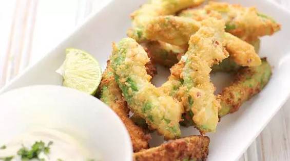 3.油锅加热后小心地将牛油果条放入,炸至金黄后取出沥干油分即可装盘。吃的时候可以配一些色拉酱或蛋黄酱。