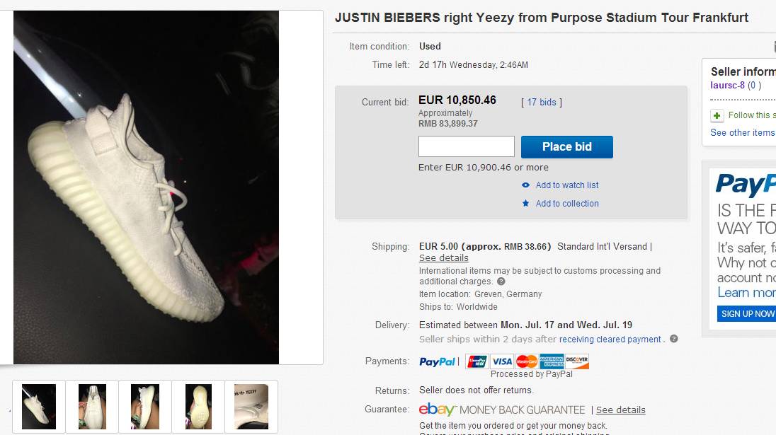 而抢到右脚的那位辛运儿则是个不折不扣的实用主义追随者,鞋子已在 Ebay 拍卖几天了,起标价 5,000 欧元,目前竞标价已高达1万多欧,约合RMB83000多元。嗯,有点晕,会上10万吗?