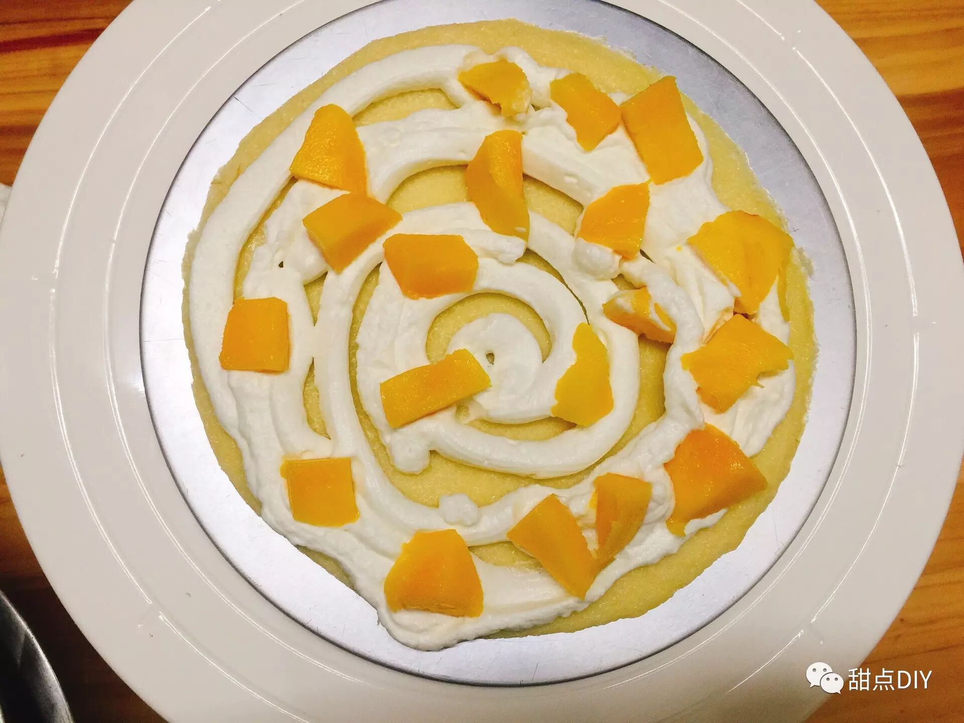 18. 将冷藏好的千层皮,取一片放裱花台,挤上一圈奶油,摆上芒果用刮刀把芒果压平,在盖入一片千层皮,依次将所有千层皮做完