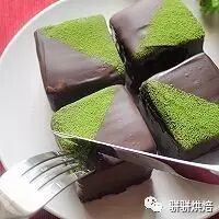 22. 待巧克力完全凝固后,用纸挡一角,用筛网筛抹茶粉在另一面,筛出图形。