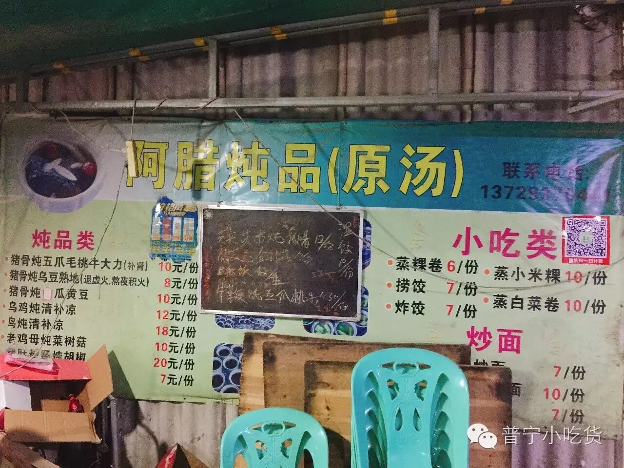 晚上的市郊灯都暗下来了,只发现一转角处“阿腊炖品”的招牌还亮着,进了路口往亮光的地方找,很多地方都漆黑一片,只有这个炖品小吃店的档口,这就是阿腊炖品,在池尾已经好几年了。