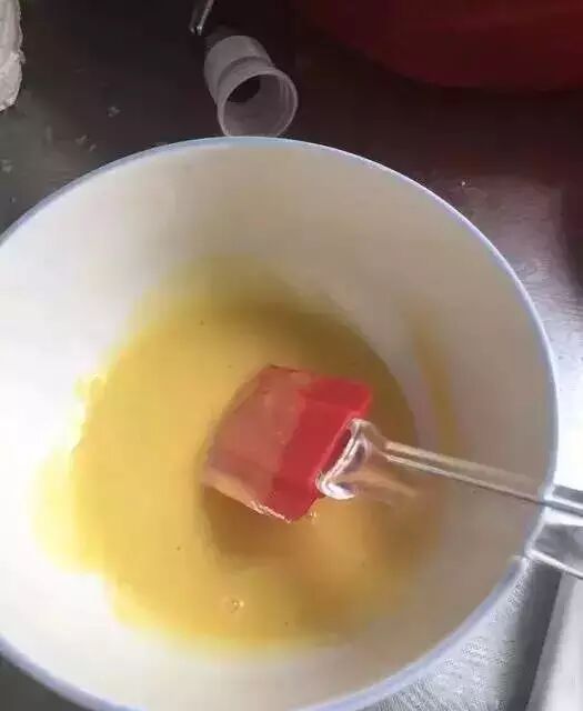♥ 4、把10g糖加到蛋黄中,用打蛋器将蛋黄打散成蛋黄液。
