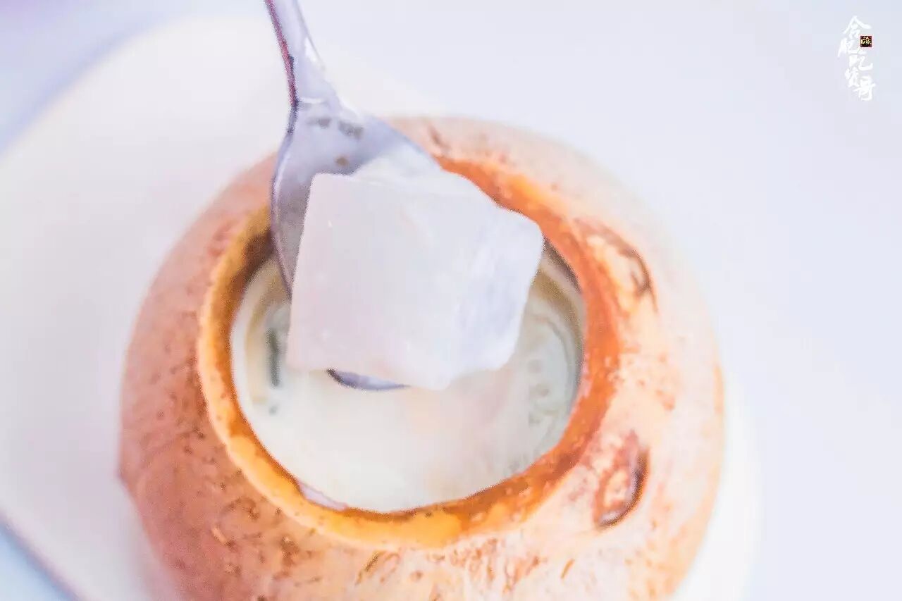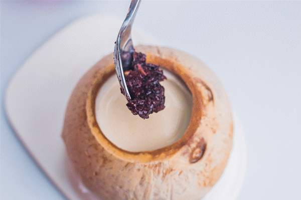 正宗吃法是把椰皇里丰富的椰果吃完,再把配好的紫米倒进椰奶里搅拌浸泡,吃透着椰香的紫米,喝渗着米香的椰奶。