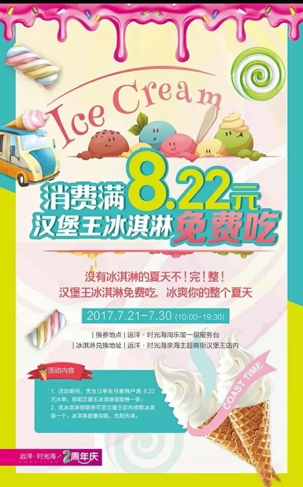 活劢内容:活动期间,任意商家消费满8.22元即可至淘乐馆服务台领取汉堡王冰淇淋兑换券一张;凭冰淇淋兑换券即可至汉堡王兑换冰淇淋一个,数量有限先到先得 送完即止。