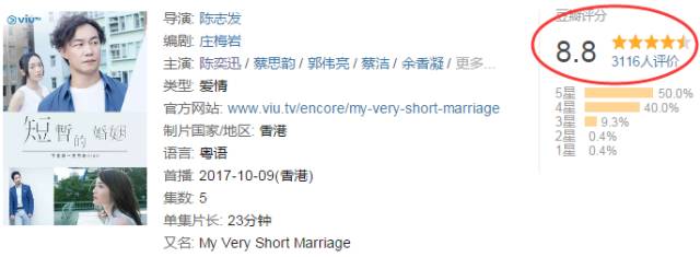《短暂的婚姻》的豆瓣评分一度达到9.1,现在是8.7分,甚至高于《使徒行者2》,成为今年第一高分港剧。