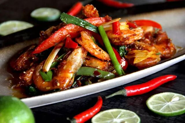 香辣虾、野菜煎蛋、黄咖喱鸡