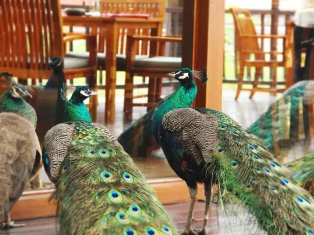 早餐最大的亮点在于:你可以在每日8点整欣赏孔雀的雄姿,几乎是此生最难忘的用餐体验。如果幸运遇上孔雀心情极好之日,你还能见证孔雀离你仅一步之遥的华丽开屏。