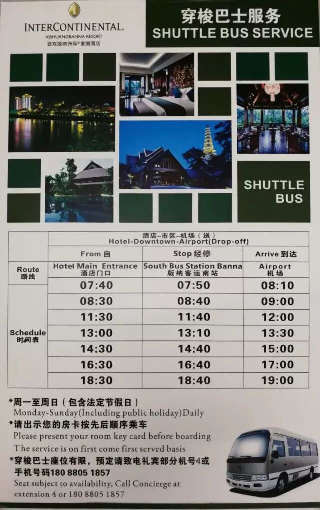 另外酒店还提供城市穿梭巴士,仅10分钟车程直达市中心,也可到达机场,具体时刻表如下: