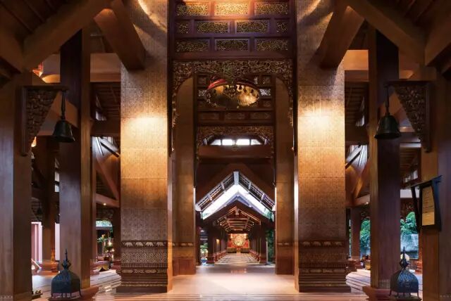 ▲一眼望不见底的酒店大堂,富丽堂皇的装饰刻着旧时傣族王宫的烙印