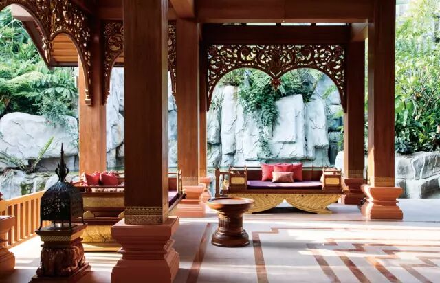 ▲金碧辉煌的大堂与窗外的热带雨林融为一体
