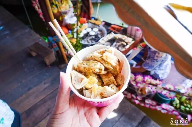 35Baht,竟然意外的好吃!料很足,都是肉,还放了花生碎! 就在河边有小桌子,要脱鞋席地而坐的那排长廊里面~
