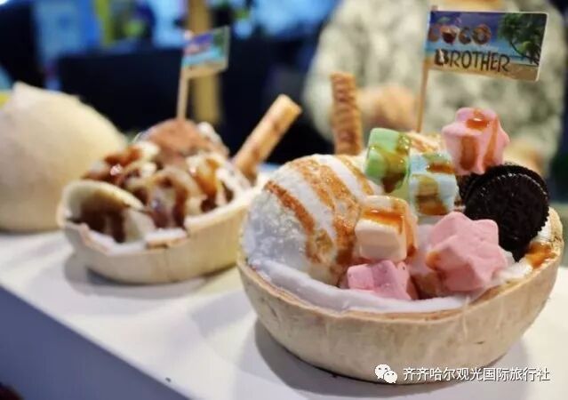 椰子冰淇淋通常是以天然的椰子壳作为容器,将入口即化的冰淇淋放入容器中,味道浓郁的椰子冰淇淋,配上炒过的脆花生或者是水煮的甜玉米,不仅提升了椰子冰淇淋的口感,而且还降低了它的甜腻。容器底部还有新鲜的椰子肉,椰肉蘸着冰淇淋吃,更加美味可口。