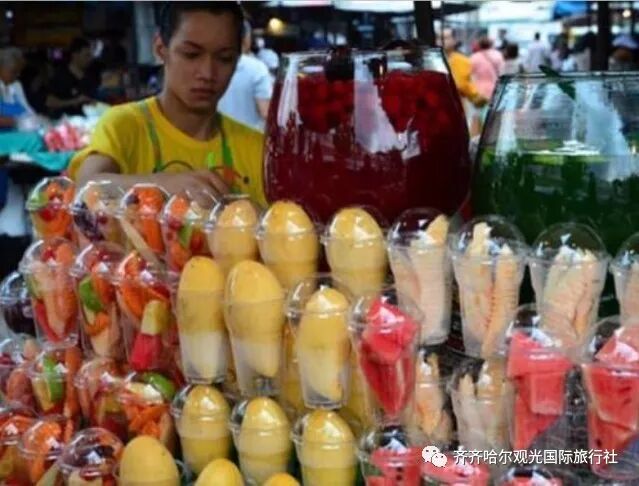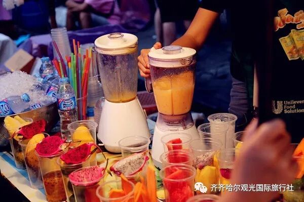 泰国是个炎热的国家,一年四季都是夏天,年均气温均在24℃~30℃,所以来泰国旅行一定少不了冰饮解暑消乏。泰国的冷饮一般喜欢利用新鲜的水果和蔬菜制作,不含添加剂和防腐剂,是纯天然的自然健康饮食。在城市的大街小巷,到处都可以看到贩卖冷饮的移动摊贩,渴了热了或者馋了,可以很方便的就能找到他们。