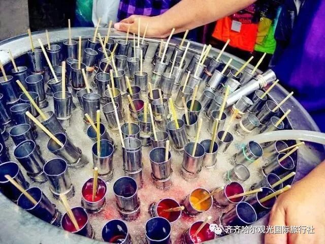 泰国这种五彩棒冰,是用超市里五颜六色的饮料进行再加工制作而成,在制作的过程中,不需要电,也不需要冰柜,实在一个完全不插电的环境下制作而成的。制作中,将超市购买的五颜六色的饮料导入圆筒铁管中,在盛有冰块的巨大盆中摇晃几秒,饮料便结成了棒冰,看起来新奇又有趣。