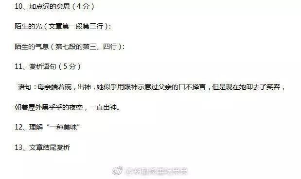 这篇阅读理解所选取的文章,是巩高峰的《一种美味》,文章大体内容是一个家庭吃鱼的经历。该大题最后两道小题的问题设计,让许多考生苦不堪言,“理解《一种美味》”、“文章结尾赏析”,该文章末尾为“现在,它早死了,只是眼里还闪着一丝诡异的光。”