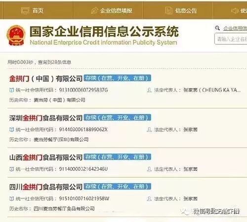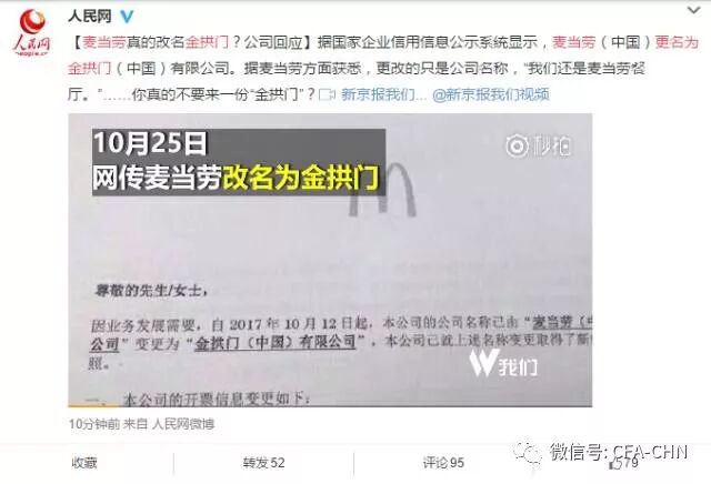 麦当劳(中国)有限公司已于2017年10月12日正式更名为金拱门(中国)有限公司;此前8月24日,投资者名称也由麦当劳中国管理有限公司变更为金拱门中国管理有限公司。