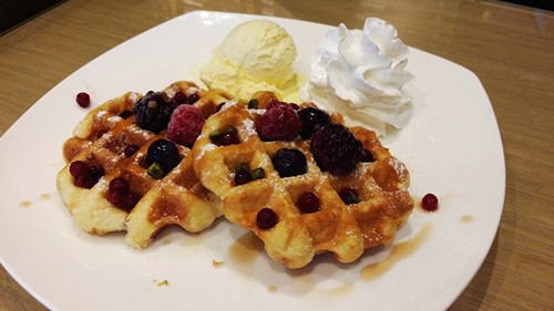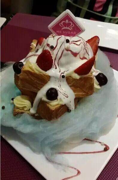 对于MS Sugar 蜜斯蜜糖而言,大家可能耳熟能详的是店家美味的甜品,殊不知他还是一家做简餐的西餐厅。“每日主厨浓汤”过后大家不妨来一份用蔬菜、水果和软糖混合制成的“MS Sugar沙拉”,若只想吃蔬菜的朋友那就试试“菇蕈果干芝麻菜沙拉”。开胃前菜作为西餐必不可少的一部分,店长为大家强力推荐“炸海鲜熔岩石”和“恶魔的诱惑”。前者运用龙利鱼、墨鱼和虾,搭配着荷兰酱,爱吃海鲜的朋友一定要尝试一下;而后者是把奥利奥和士力架分别裹着面粉经过高温油炸制成,正是食物的甜美和高热量让小伙伴们又爱又恨,因此取名为“恶魔的诱惑”。主食方面“热烤薄饼”和“手作贝果三明治”均是店铺特色,尤其“手作贝果三明治”是北京独一家。最具诱惑的甜品则有“草莓天堂丹麦云朵城堡”、“爆浆半熟凹蛋糕”、