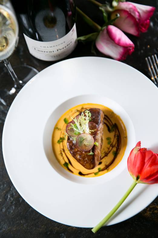 仅此一天的甜蜜节日,绝不能少了鹅肝。香煎至金黄的鹅肝拥有如慕斯般的细腻香甜,覆于清爽甘脆的无花果肉,浇上醇厚微甜的南瓜酱与自制洋葱酱。这道佳肴并不会甜到腻味,而是回荡唇舌间的微微细甜,长久隽永。