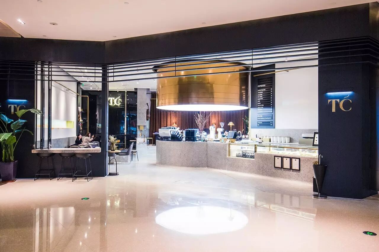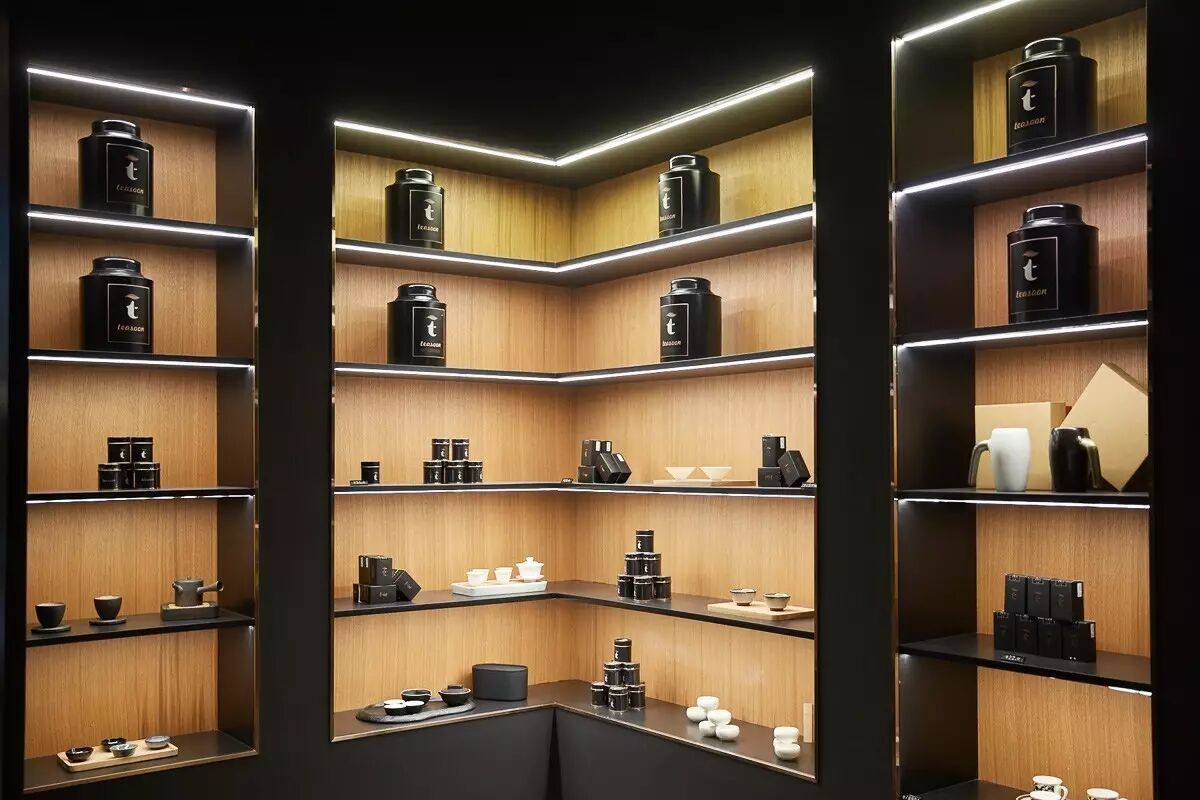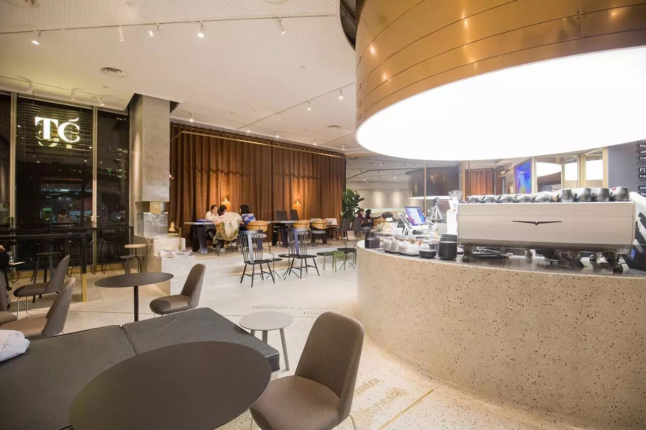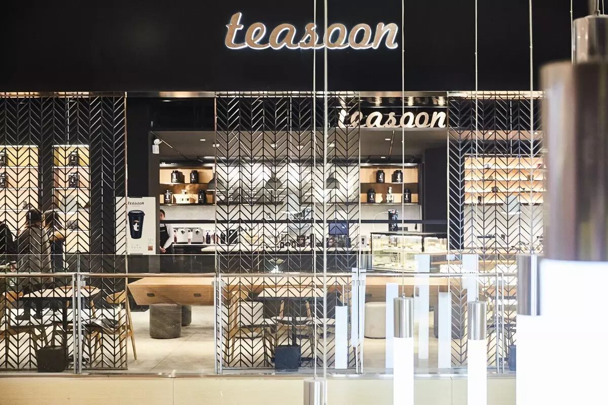 整个店面以黑金为基调的Teasoon,是一家质感好的不得了的茶饮店。长桌下的凳子按灰白黑白灰的顺序排列,有序又有设计感。每个椅子都会对应一个插座在长桌下方,非常贴心。