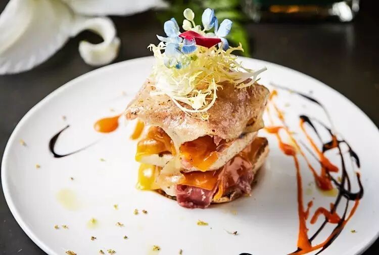 同样都是火腿,这道千层塔表层的必然芝士和曼彻德芝士层经炙烤,更带了一股烟熏味。在芒果莎莎和樱桃番茄的酸甜轰炸后,火腿单配哈密瓜的时代已然成为了过去时!