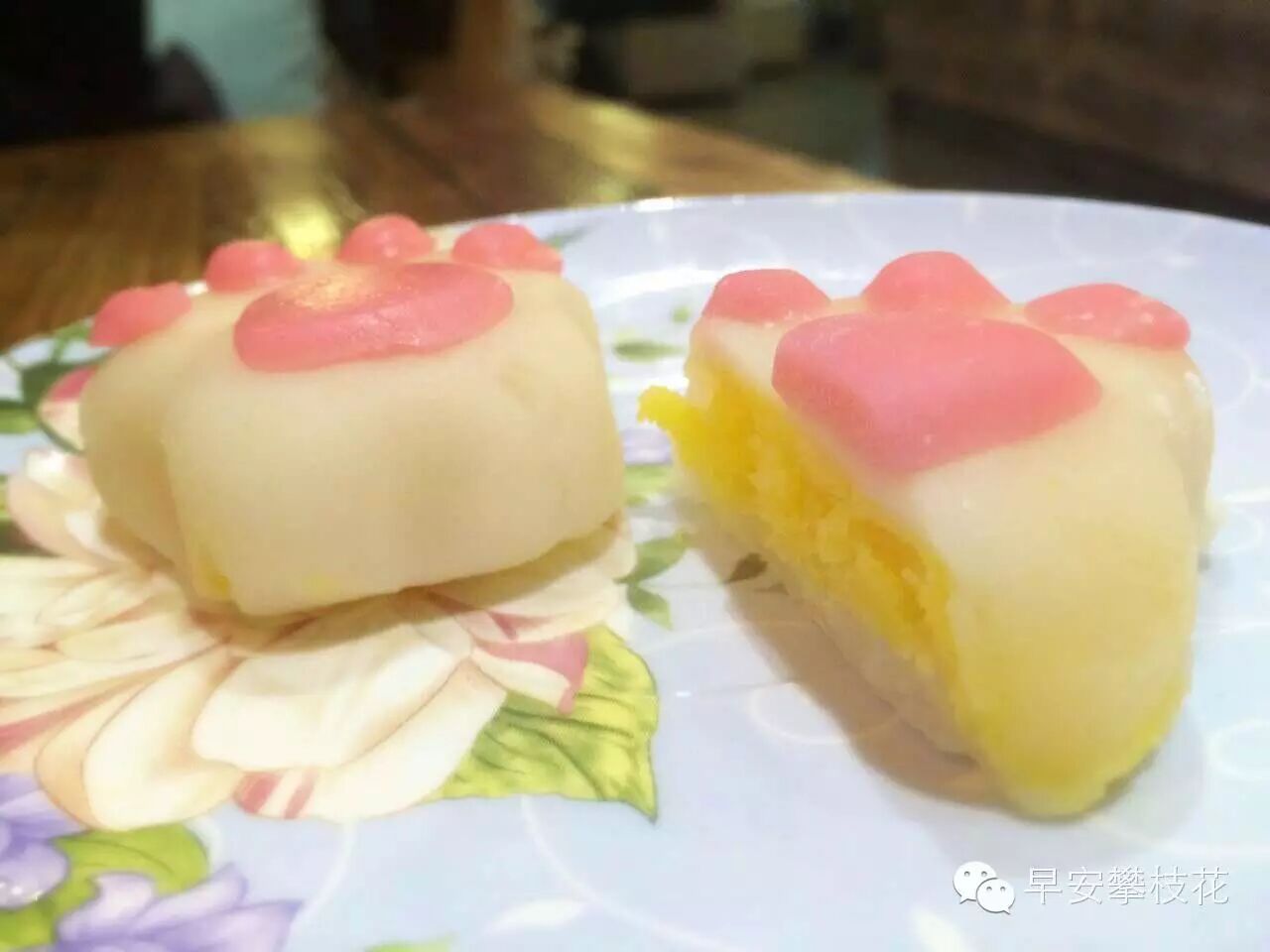 光看着就让你的心先融化了,你还舍得下口么,冰皮的口感,淡淡的蛋香,里面有用蛋黄哟~ 但味道真的很香,像枝枝我这种不吃鸡蛋的人都超爱吃味儿。