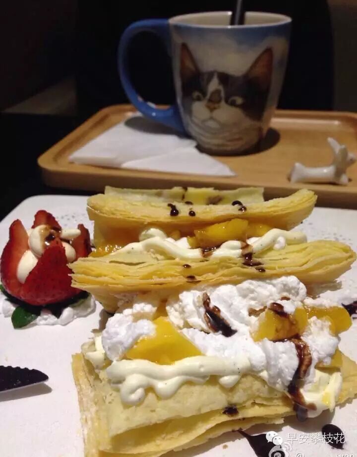 松脆的千层酥撞上香浓不腻的进口奶油,还有新鲜的草莓和芒果,此时喝上一口手冲奶茶,闭上眼享受顿时感觉甜蜜在飞~