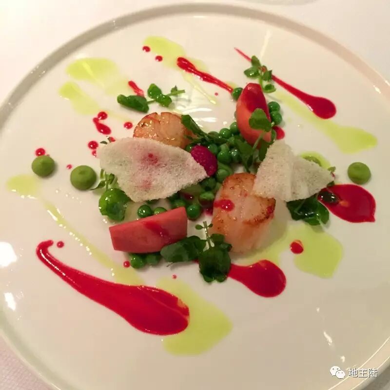 和我一起就餐的朋友不常吃法餐,但以他出版人的视野和敏锐发表了他的评价:这个摆盘有现代画儿的风格。没错,摩登法餐就是喜欢这样涂抹。煎得香嫩的扇贝可以蘸嫣红的覆盆子酱汁,也可以蘸嫩绿的薄荷酱汁,食客也像是参与了画儿的创作