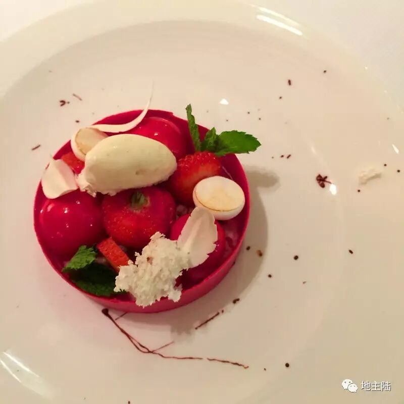 草莓及莓果酸甜,比传统法式甜品降低了一半的甜度,在初夏吃起来更清爽。餐后咖啡配的小甜点就恢复了法式的甜度,搭配咖啡合适