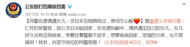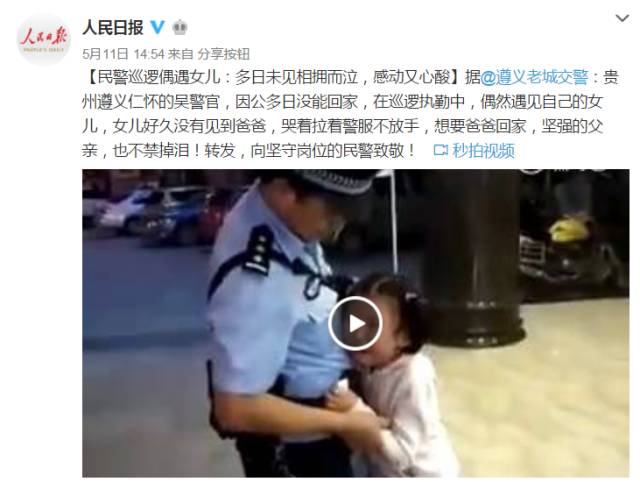 日前,一段民警巡逻遇到6岁女儿的视频,,在视频中,哭泣的女孩在对父亲撒娇,隐约能听见民警说,“幺儿,不要哭了,我加班回来给你买好吃的……”