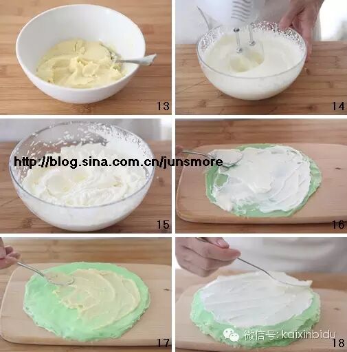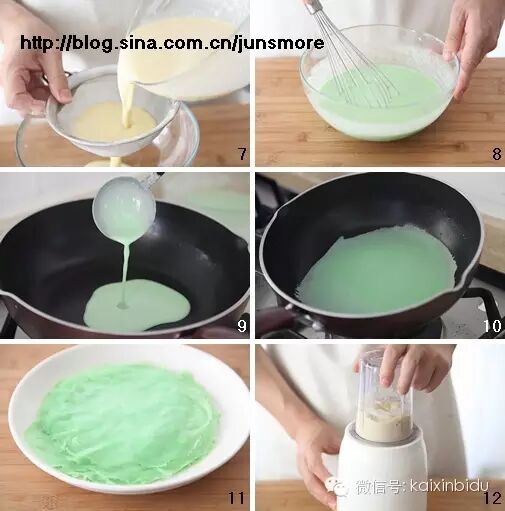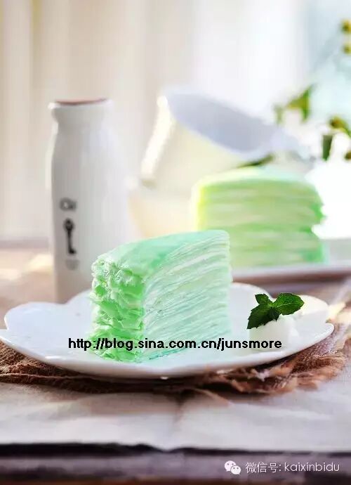 千层饼皮配料:低筋面粉160克,糖粉60克,鸡蛋6个,牛奶520克,黄油30克,绿色食用色素少许(可不用)