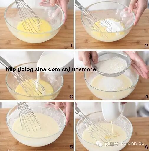 1、首先制作千层饼皮(配方的分量较多,因为容器的限制,一次性做这么大量不太好搅拌,所以分了两批来做,过程图所演示的是一半的分量)。鸡蛋在大碗里打散。