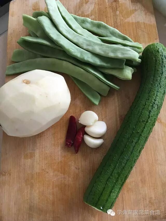 原料:豆角、土豆、丝瓜、蒜、干辣椒、少许肉