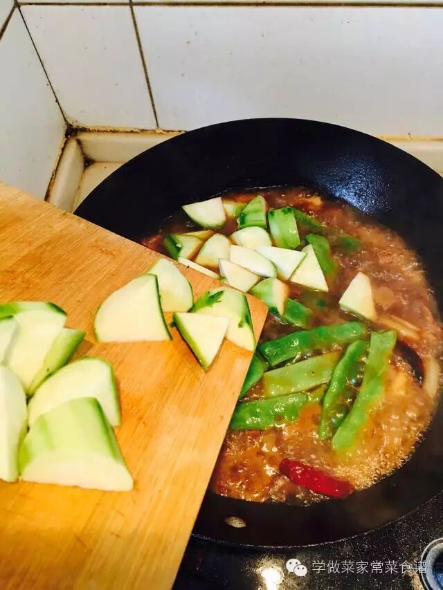 第二步:锅中加入少许油烧热下肉片、蒜片、干辣椒煸香,然后将土豆片下锅煸炒出香味后下豆角加酱油调色,最后加适量水烧开小火炖煮10分钟左右将丝瓜下锅调盐味,最后收汁即可