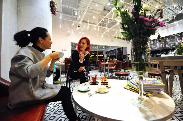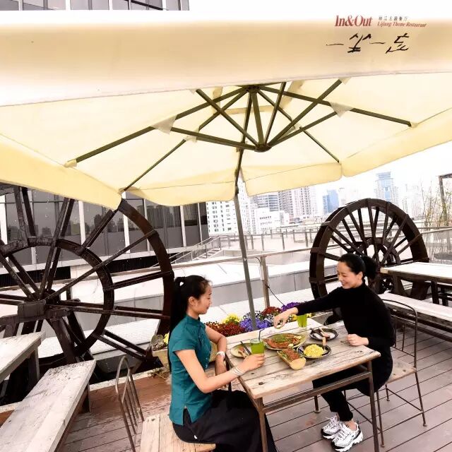 ▶︎新天地太平湖边最大的空中花园,晒晒太阳?,在有大水车的户外享用美食,实在是太奢侈的体验。坐在俞菱对面的是丽江主题餐厅一坐一忘的店长来自纳西族的姑娘,她说这里细致到一草一木都是从云南带过来的,空中花园里的好几棵树搬来时都需要靠吊车吊上来,现在都种植存活了。
