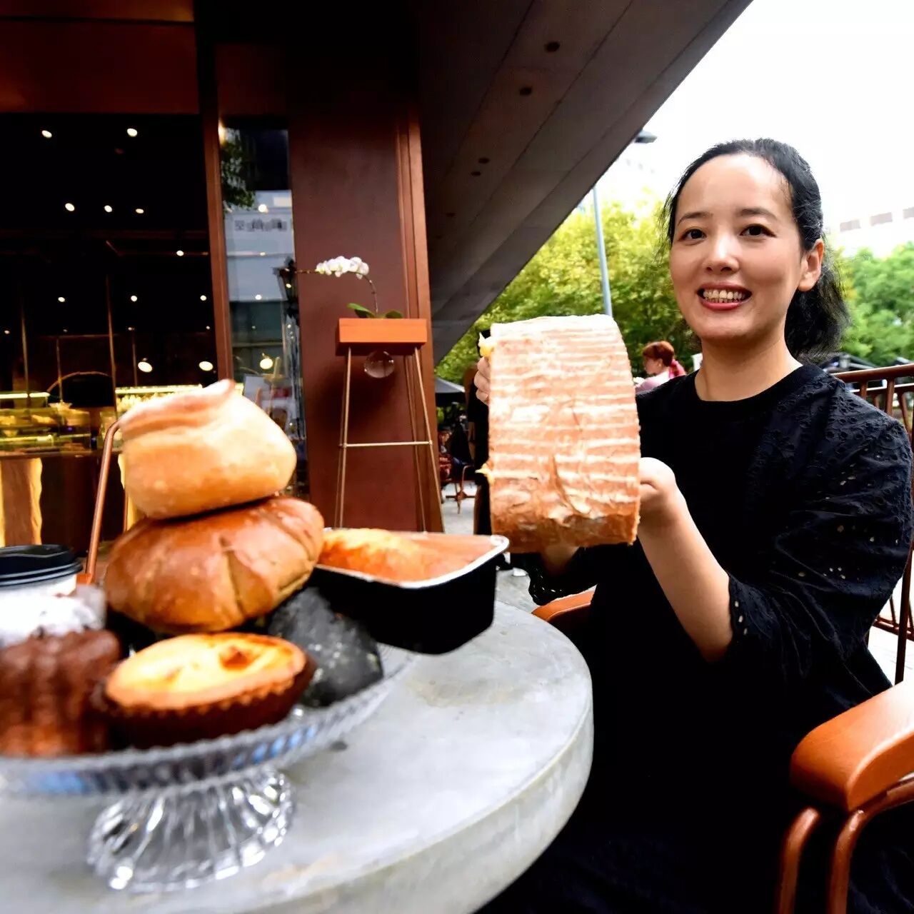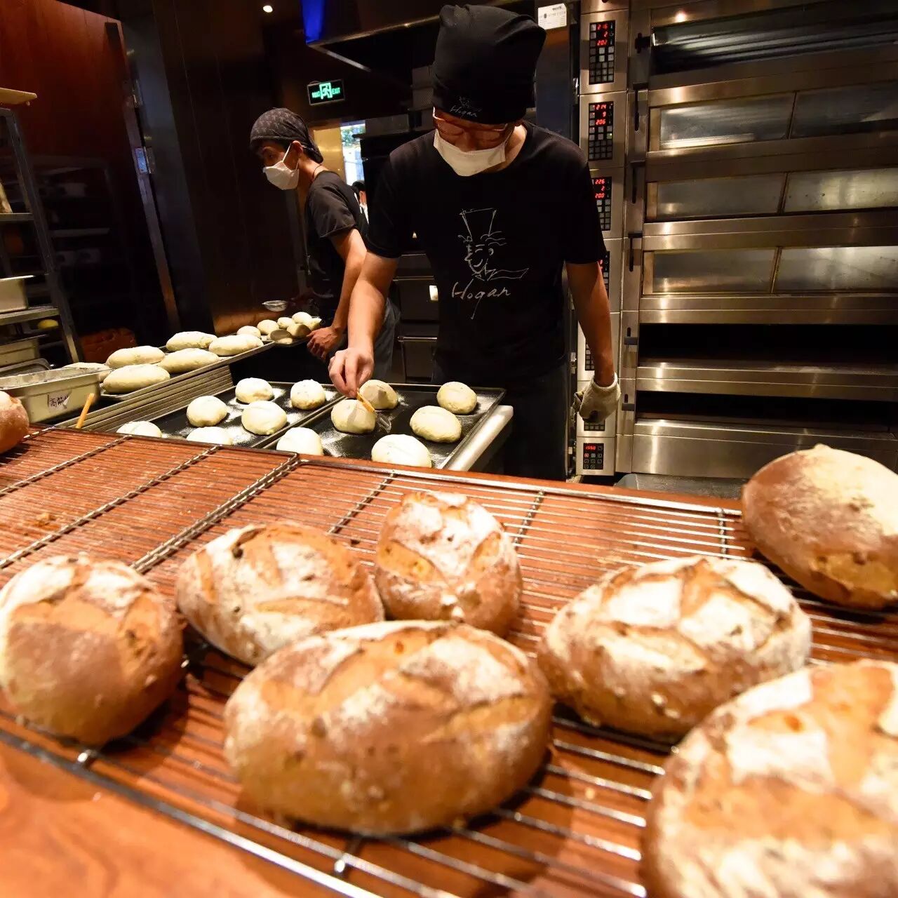 ▶︎ 刚登陆魔都不到一个月的Hogan,有140多种口味的面包。俞菱手中切开的大面包面积已经很惊人了,但刚烘培出来足有1米多长。当很多人还在吃着各种冷冻面团的同时,这里的面包已保持面团筋性不易老化,让面包更湿润及小麦风味,是市场上少见每日十几小时不停炉的店。