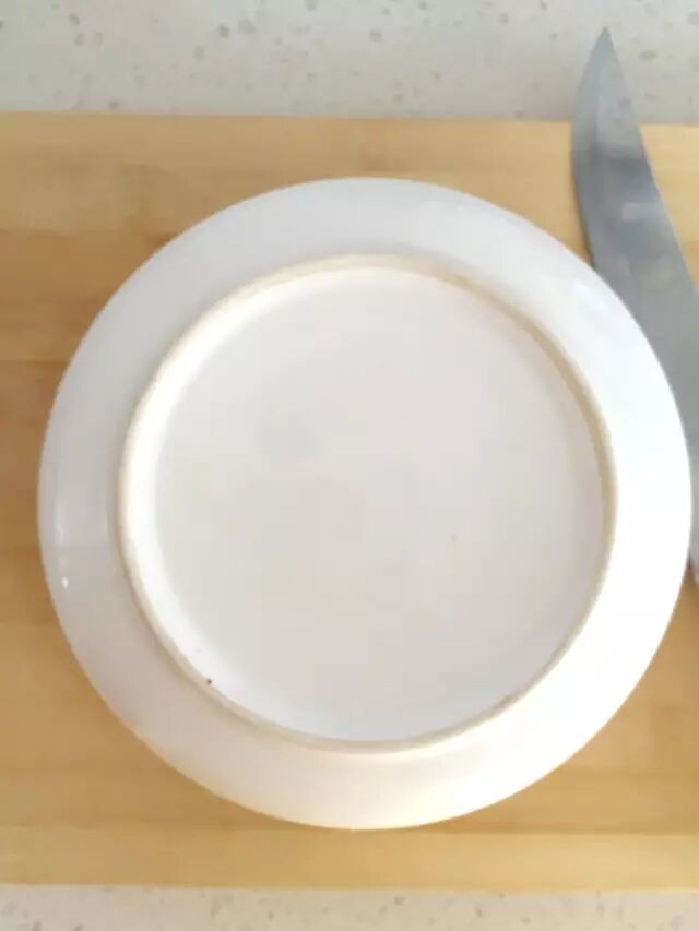 7.煎好的面皮可以找个大小差不多的盘子扣上,裁掉多余的边。然后放进冰箱冷藏30分钟。冷藏面皮的时间可以把芒果切块。打发奶油。400克的奶油加入45克糖打发。