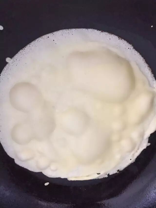 6.把面糊倒入。最好用一个勺子。每一张都放一勺面糊。这样煎好的冰皮大小一致。只需一面煎即可。然后依次煎好所有的面皮。