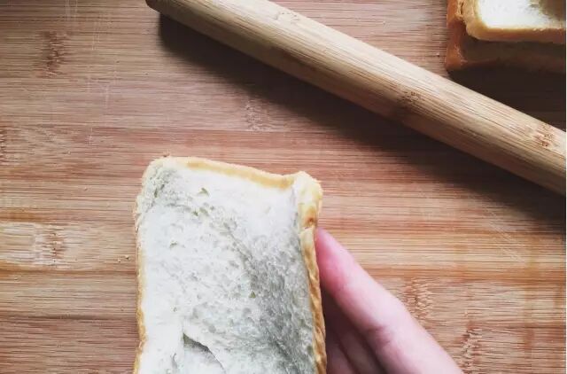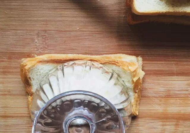 4. 然后对折用小碗用力扣住使吐司粘合,去掉多余的吐司