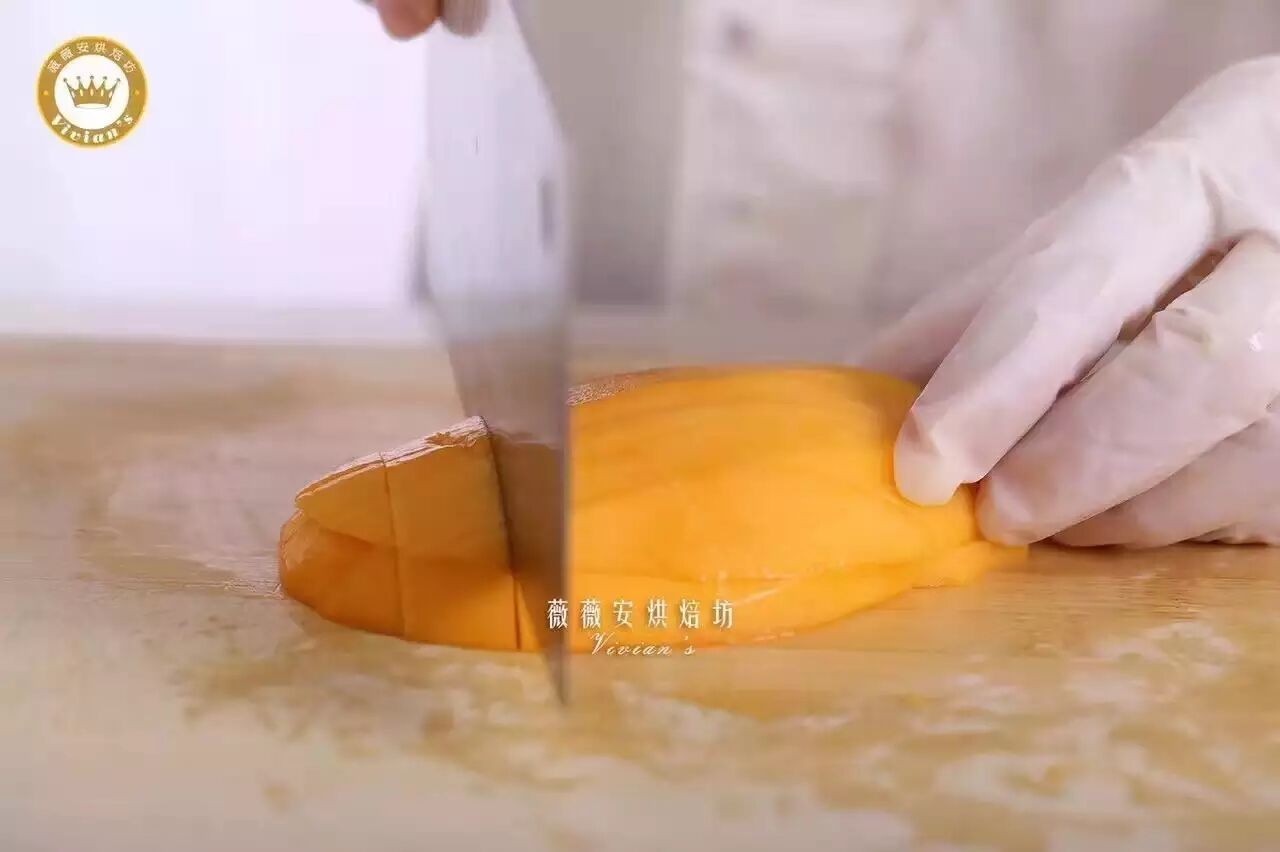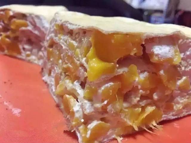 厚厚的纯榴莲果肉往蛋皮上一层层抹,