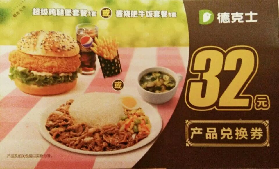 32元兑换劵包含(超级鸡腿堡+中薯+中可)或(酱烧肥牛饭+菠菜芙蓉汤一份)