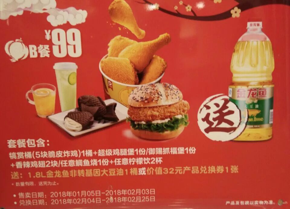 99元:“新春油礼”套餐包含:犒赏桶(5块脆皮炸鸡)一桶+御赐抓福堡一份或超级鸡腿堡一份+辣翅一对或任意鲷鱼烧一个+任意柠檬两杯