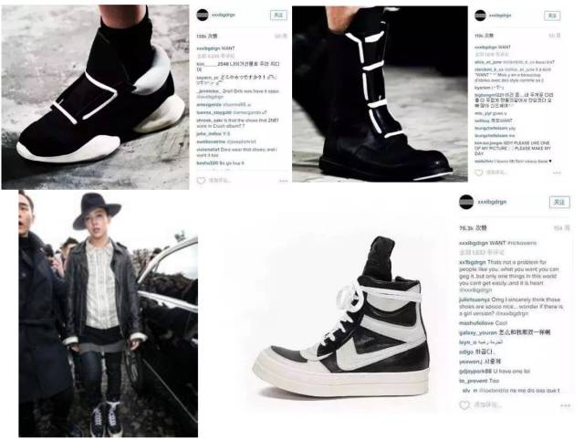 在rick owens还没有正式成为新一代街鞋之前,权志龙就曾多次在Instagram上表露自己对ro的喜爱,连说了三个“WANT”。